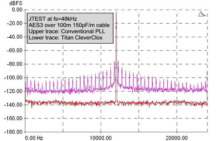 The graph below shows the effects of 'JTEST', a special test stimulus to expose jitter susceptibility of D/A converters. JTEST is basically an fs/4 tone (12kHz at fs=48kHz) which is specially coded to cause an AES3 or S/PDIF carrier transmitted over a lossy cable to become very jittery by the time it reaches the receiving D/A converter. The jitter produced has regular frequency components fs/96 apart (500Hz at fs=48kHz). The quality of the D/A converter's jitter rejection is shown by the degree to which it suppresses the resulting 500Hz-spaced side-tones. In the example below, the upper trace shows the poor jitter rejection of 'conventional' D/A converter design, where the conversion clock is derived directly from the AES3 or S/PDIF receiving chip, without any further jitter filtering. Remember that none of these side-tones is present in the digital audio signal - they are caused only by jitter. The lower trace shows almost complete jitter rejection across the band by the CleverClox process in Titan.