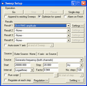 Frequency response sweeps utilise the sinusoidal signal generator function and basic amplitude analysis (either Signal Analyzer¹ or Continuous Time Detector¹ (CTD), which can also incorporate a filter function). THD+N can be analysed with a swept CTD¹ result or FFT result. THD and individual harmonics can be swept using FFT results¹. Up to 4 different results can be swept simultaneously using dScope.